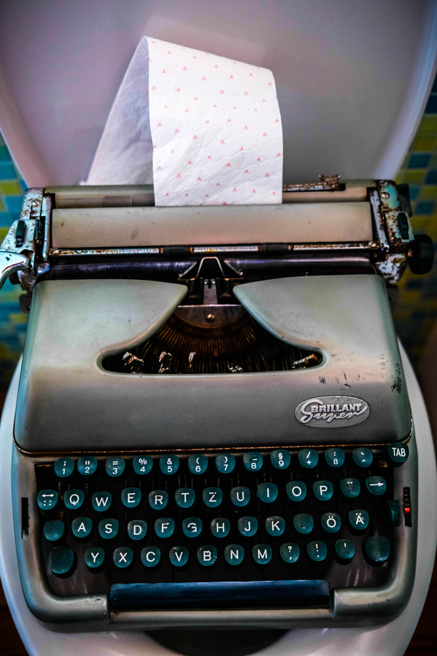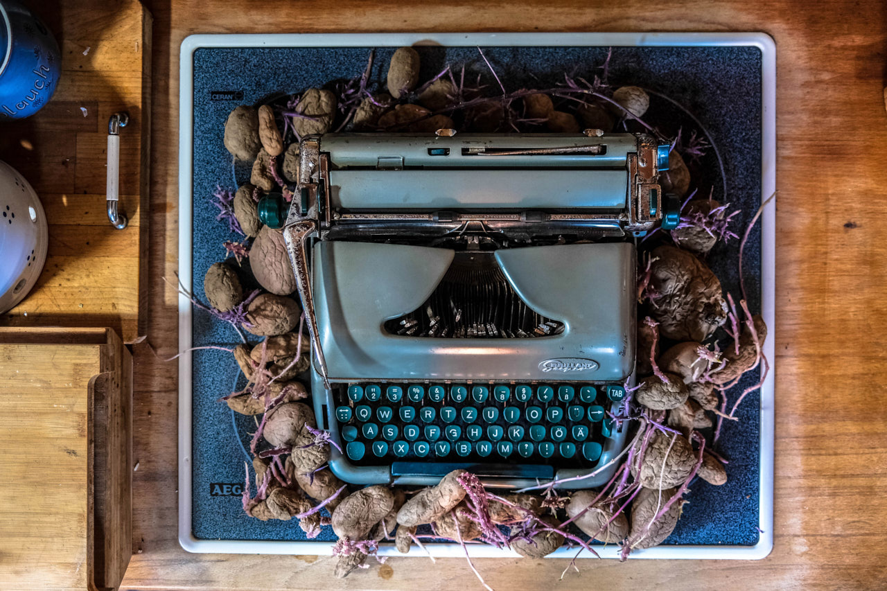 Die Idee ist die, dass diese Schreibmaschine ja bereits einmal weggeworfen wurde, also bereits Weggeworfenes war. Also habe ich mir gedacht, ich gruppiere das Teil mal mit entsprechenden weggeworfenen Kumpels aus meinem persönlichen Abfall. Nun ja, es wurden einige gefunden.